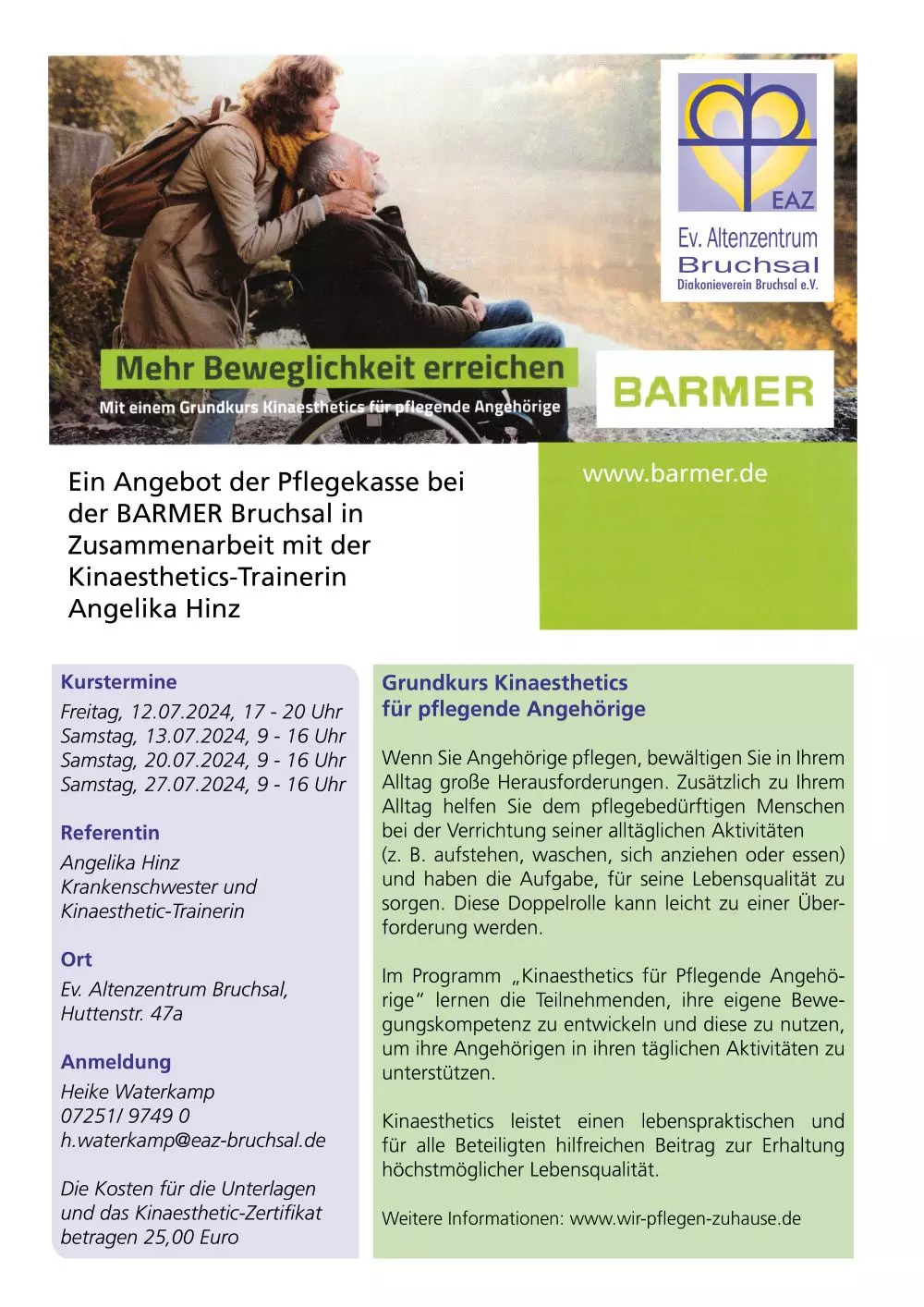 Gerne empfehlen wir den „Grundkurs Kinaesthetic“ der Barmer Bruchsal unseren Kund*innen der Diakoniestation, Angehörigen unserer Bewohner*innen sowie unseren Mieter*innen des Betreuten Wohnens sowie allen Interessierten! Der Kurs ist kostenlos und findet statt im Ev. Altenzentrum Bruchsal. Bei Interesse steht Heike Waterkamp (07251/ 9749 0) für weitere Informationen gerne zur Verfügung!