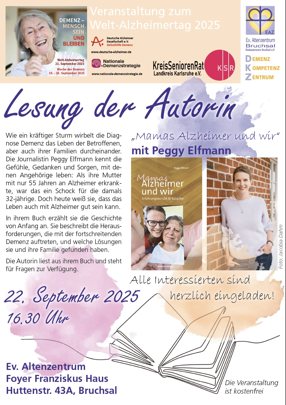 Wie ein kräftiger Sturm wirbelt die Diagnose Demenz das Leben der Betroffenen, aber auch ihrer Familien durcheinander. Die Journalistin Peggy Elfmann kennt die Gefühle, Gedanken und Sorgen, mit denen Angehörige leben: Als ihre Mutter mit nur 55 Jahren an Alzheimer erkrankte, war das ein Schock für die damals 32-jährige. Doch heute weiß sie, dass das Leben auch mit Alzheimer gut sein kann. In ihrem Buch erzählt sie die Geschichte von Anfang an. Sie beschreibt die Herausforderungen, die mit der fortschreitenden Demenz auftreten, und welche Lösungen sie und ihre Familie gefunden haben. Die Autorin liest aus ihrem Buch und steht für Fragen zur Verfügung.