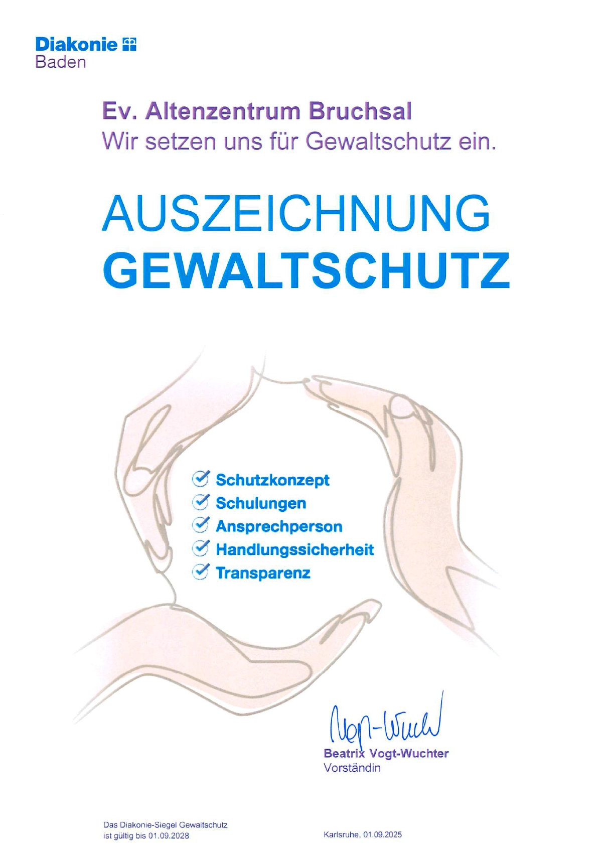 Mit Freude haben wir im September 2025 die Urkunde „Auszeichnung Gewaltschutz“ erhalten. Wir haben nachweislich die zentralen Bausteine für einen wirksamen Gewaltschutz bei uns umgesetzt: Schutzkonzept, regelmäßige Schulungen, Benennung einer Ansprechperson, Maßnahmen zur Handlungssicherheit sowie transparente Prozesse. Damit setzen wir ein starkes Zeichen für den Schutz und die Würde der uns anvertrauten Menschen. Gewaltschutz wird bei uns aktiv gelebt. Die Urkunde ist für drei Jahre gültig und würdigt unsere kontinuierliche Arbeit für ein sicheres und respektvolles Miteinander.