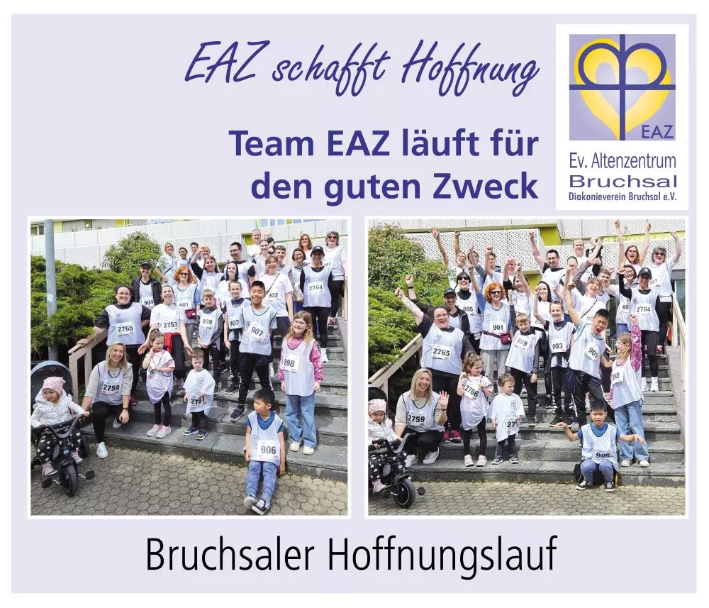 Auch in diesem Jahr hat sich das Ev. Altenzentrum mit einem Team an Mitarbeitenden und ihren Familien am Bruchsaler Hoffnungslauf am 4. Mai 2024 beteiligt. Rund 30 Teilnehmende liefen im EAZ-Shirt ihre Runden für den guten Zweck. Das gute Wetter und ein entspanntes Miteinander sorgten für gute Laune. Und nicht nur für gute Laune, sondern auch für Erfolg: das „EAZ-Team“ ist insgesamt 57 Runden gelaufen!