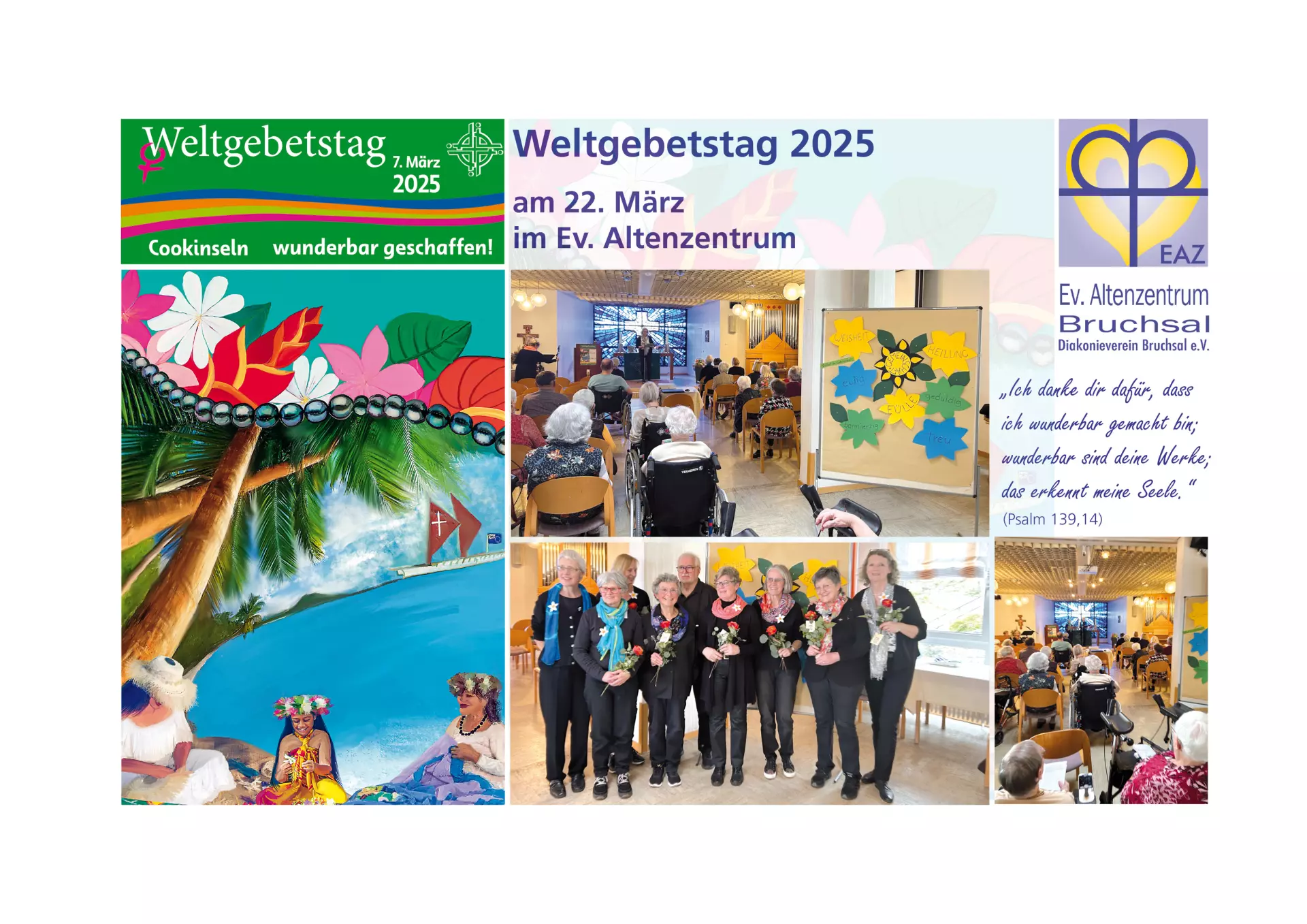Am Samstag, 22. März 2025 durften wir gemeinsam mit Bewohner*innen und Mieter*innen den Ökum. Weltgebetstags-Gottesdienst im EAZ feiern. Mit vielen kreativen Ideen, bunten Bildern und Informationen sowie vielfältigen Liedern und Texten tauchte die Gemeinschaft ein in die Welt der Cook-Inseln im Südpazifik. Dem organisierenden Team sei für diesen beeindruckenden Nachmittag herzlichst gedankt!