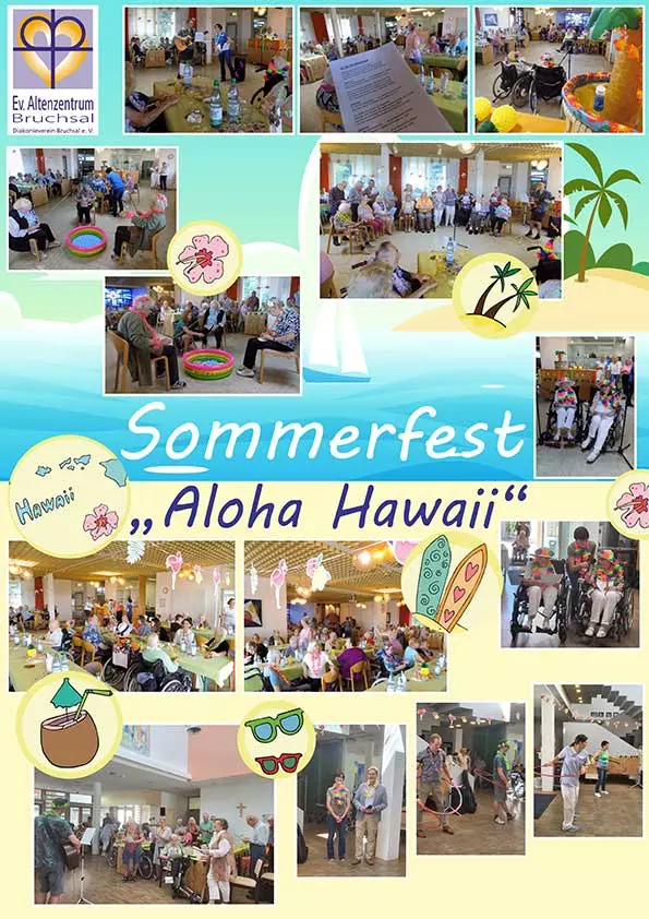 Unter dem Motto „Aloha Haiwaii“ feierten wir im Ev. Altenzentrum an zwei Terminen jeweils im Dietrich Bonhoeffer und Franziskus Haus unser Sommerfest. Mit Blumenkränzen, bunter Deko, Palmen, Cocktails und jeder Menge guter Laune verbrachten unsere Bewohner*innen und Mieter*innen einen kurzweiligen und unterhaltsamen Sommernachmittag. Singen, kreatives Spiel & viel Spaß sowie kulinarische Freuden standen auf dem Programm.